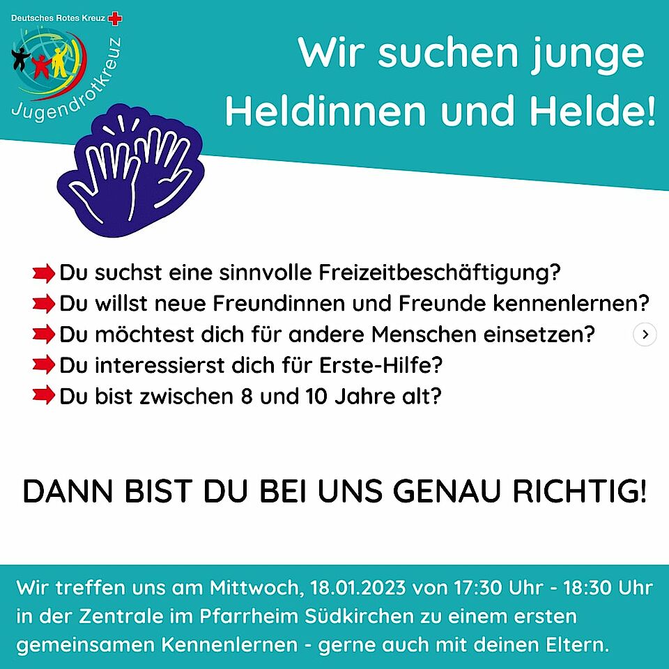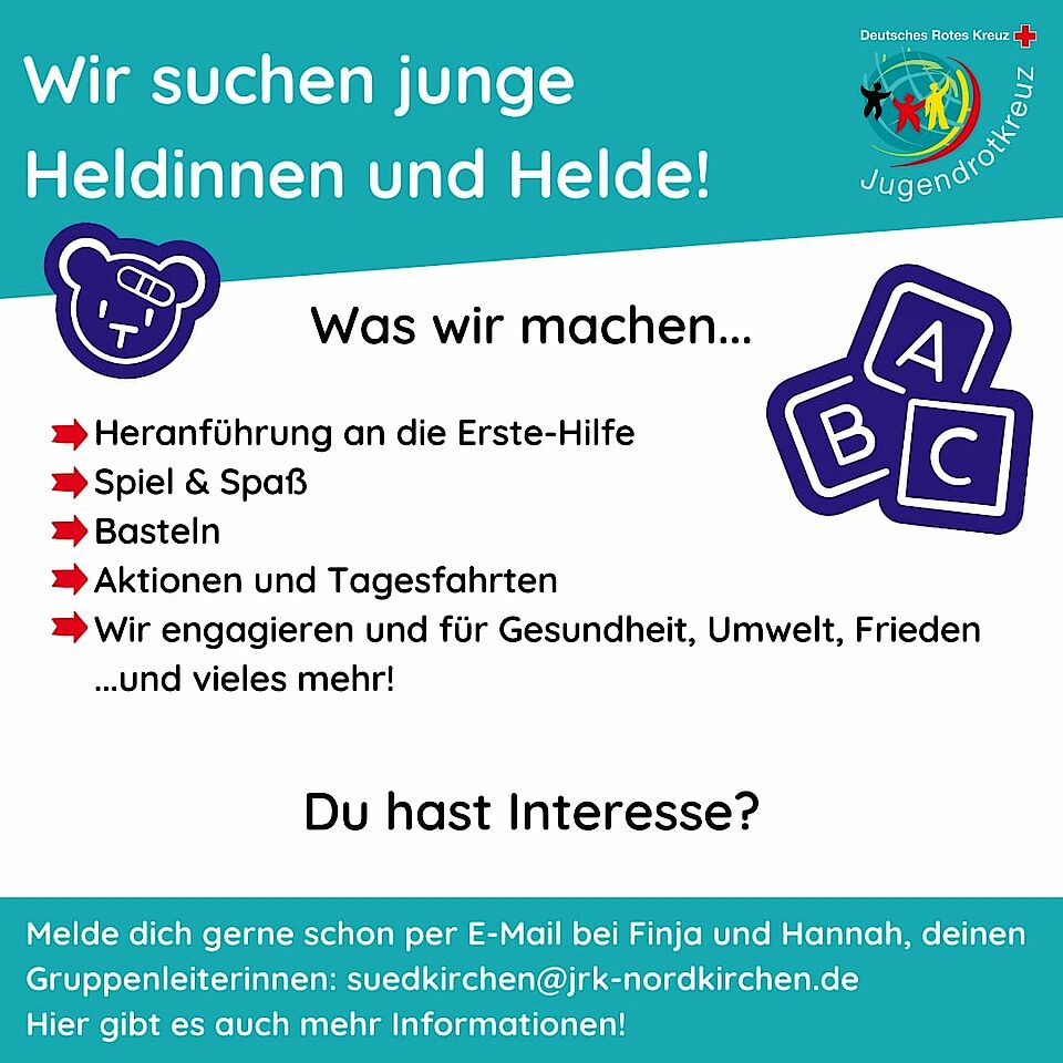 Wer Interesse hat, meldet sich gerne bei Hannah und Finja, den Gruppenleiterinnen: suedkirchen@jrk-nordkirchen.de